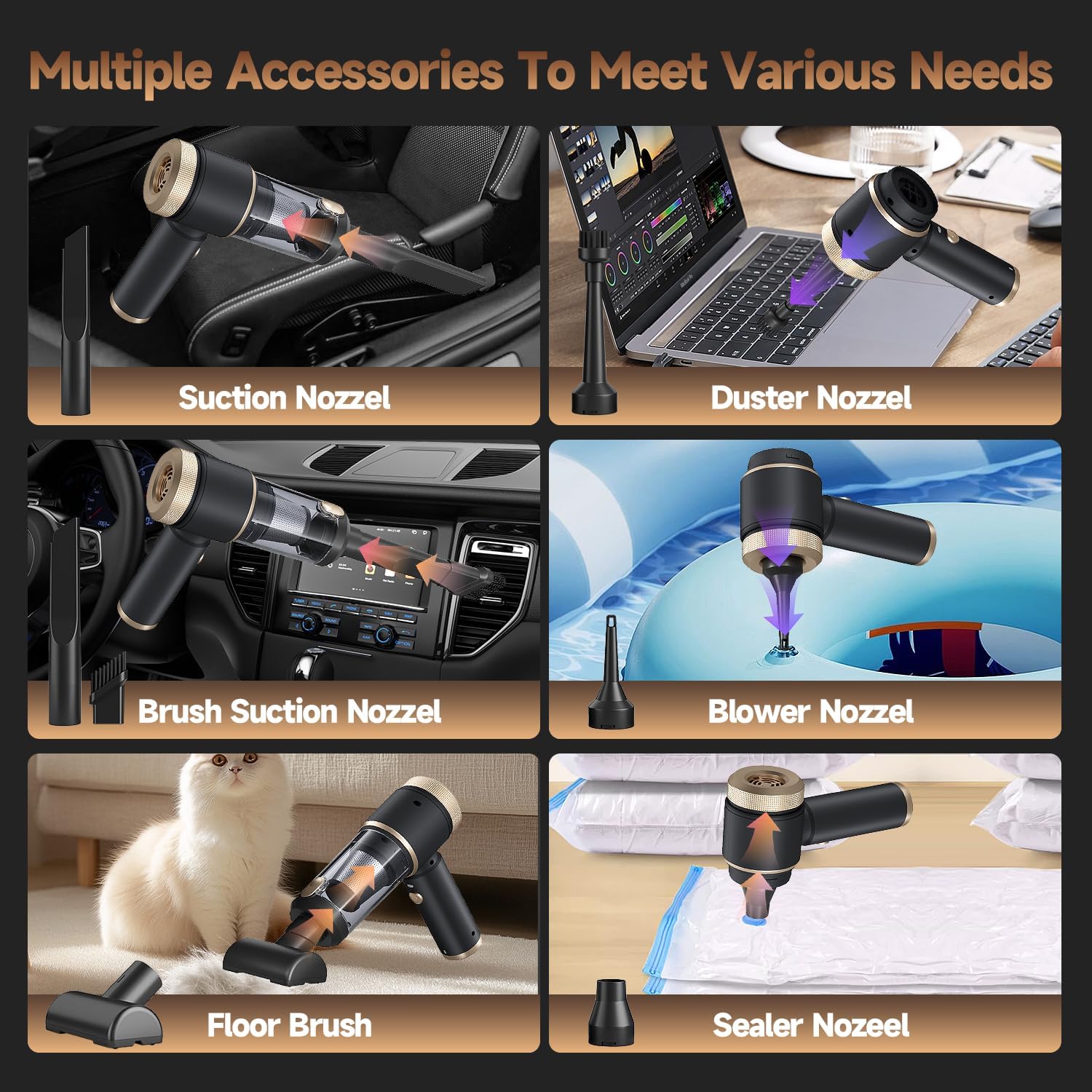 - ă7-IN-1 Multi functional Car Vacuum CleanerăThe handheld vacuum cleaner Includes 7 exclusive accessories and can clean at multiple angles. It combines blowing, suction, inflation and compression modes into one. It is not only a vacuum cleaner, but also a blower. The round-headed brush can blow away dust from keyboards and narrow gaps, the nozzle can inflate balloons or compress bags, and the floor brush and nozzle brush can suck away all hair and various particle debris, which can meet your cleaning needs in any scenario.