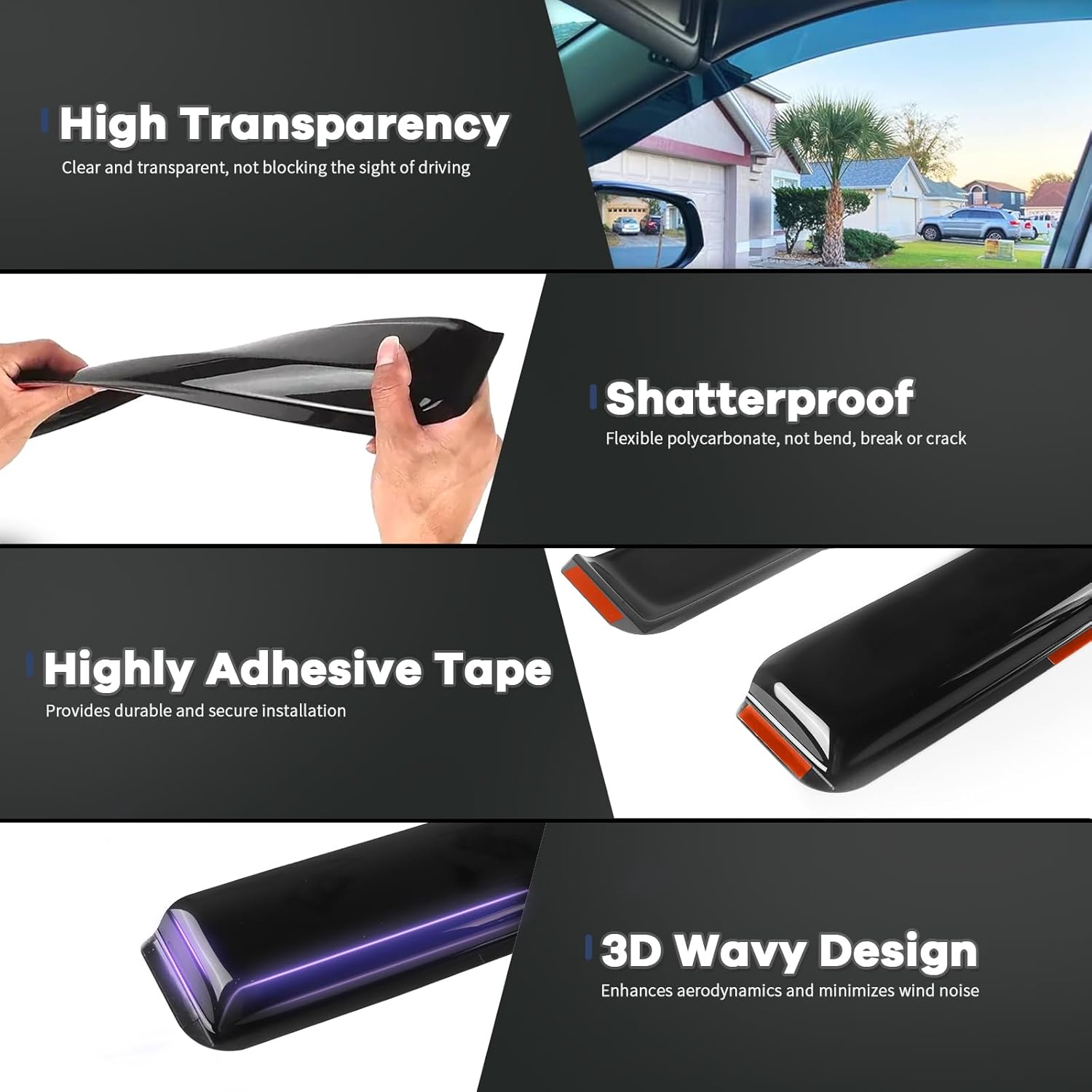 - ăImproved Ventilation and Air FlowăAllows fresh air to circulate through open windows while keeping the rain out or reduces heat. Reduce mirror and window fogging; reduce sun glare through side window. Dark Smoke translucent color will not obstruct the driver's view while driving