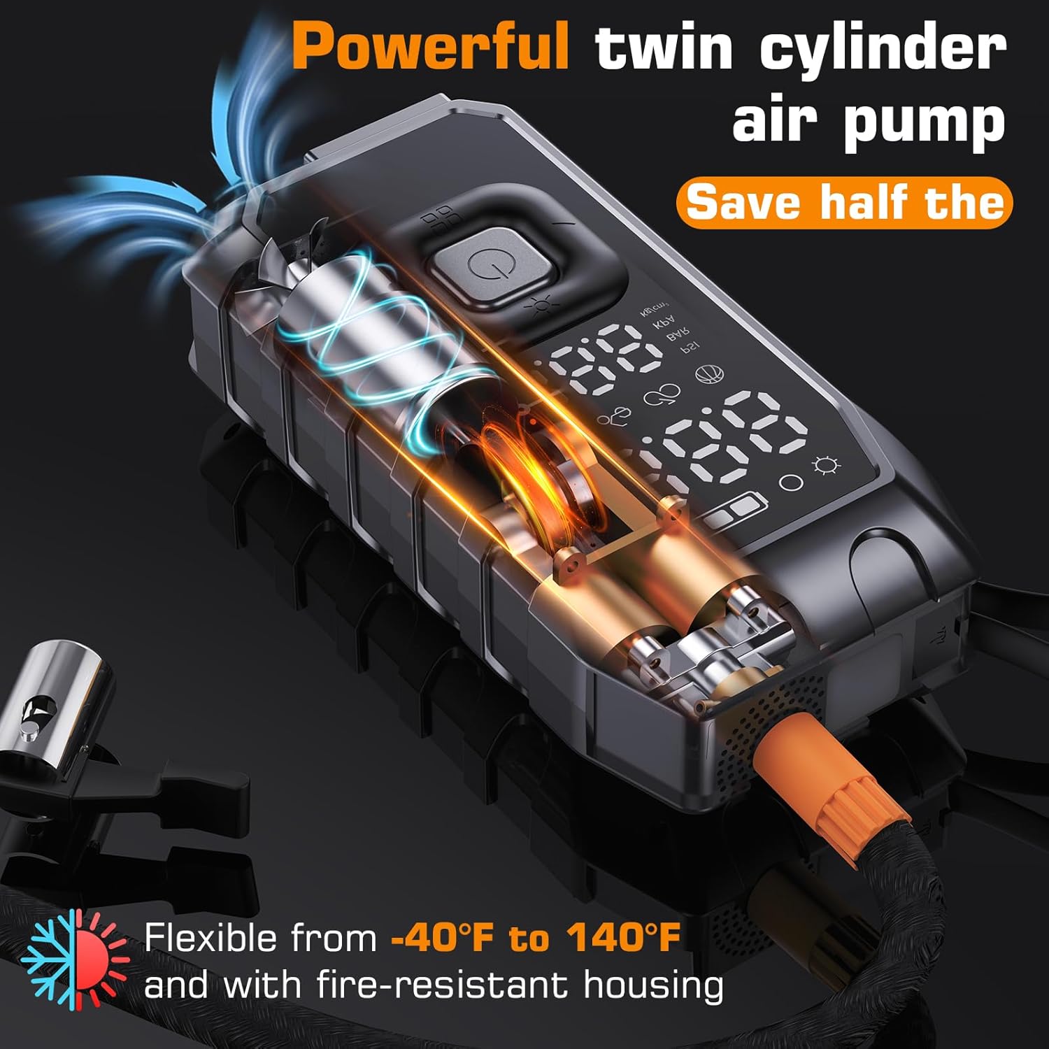- 【12000mAh & Dual Cylinder Air Pump】Portable Air Compressor for Tires is built with a high-density lithium battery, can be started in any extreme environment, for All Gas and 10.0L Diesel Engines. 180PSI dual cylinder air compressor, tire inflation speed increased by 50%.