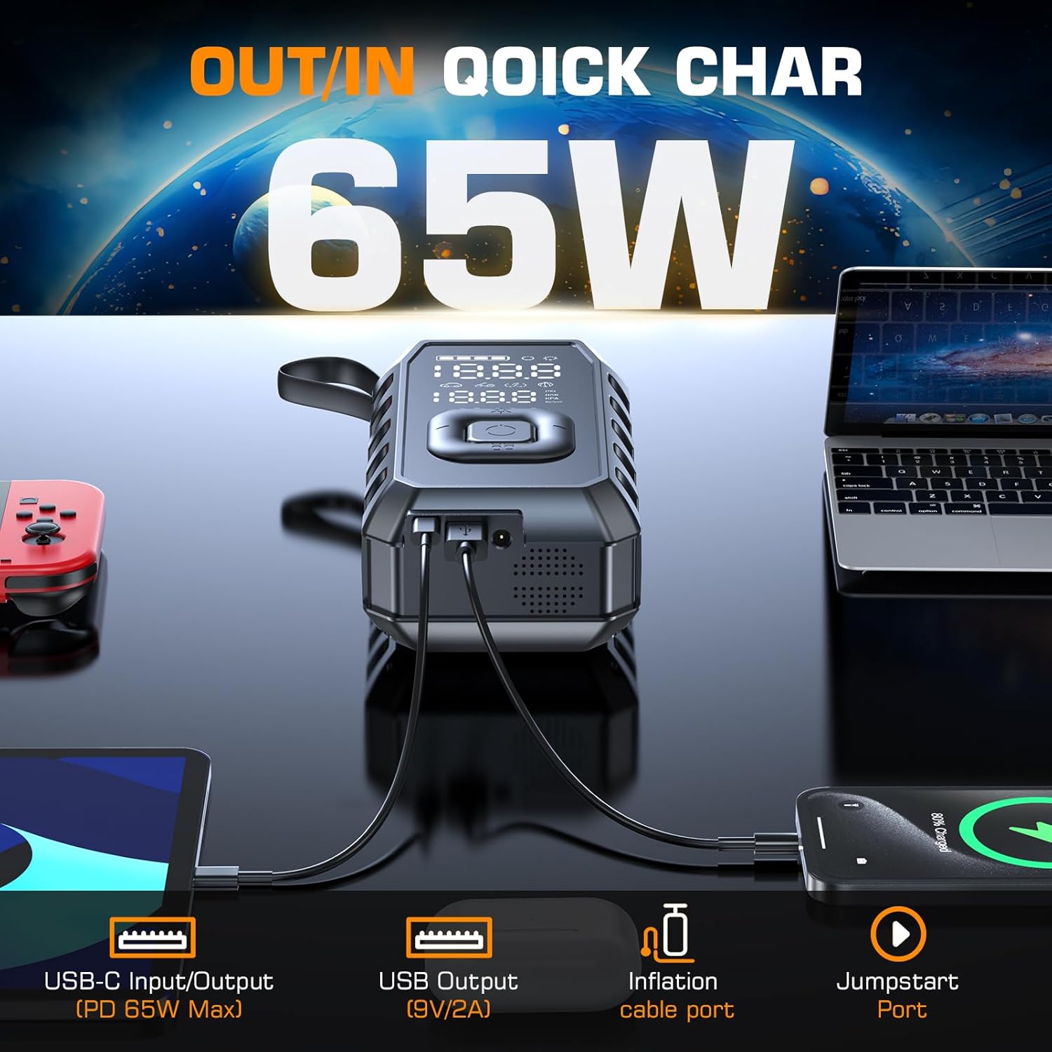 - 【Multifunctional & Professional Configuration】40cm ultra-thick pure copper cable (20% longer than ordinary models), -40℃ antifreeze rubber wrap. Comes with splash-proof spark clip, air pump hose, EVA storage bag, and multiple inflator nozzle adapters. In addition, it also integrates a 400-lumen LED flashlight with multiple lighting modes, including emergency strobe and SOS emergency rescue.