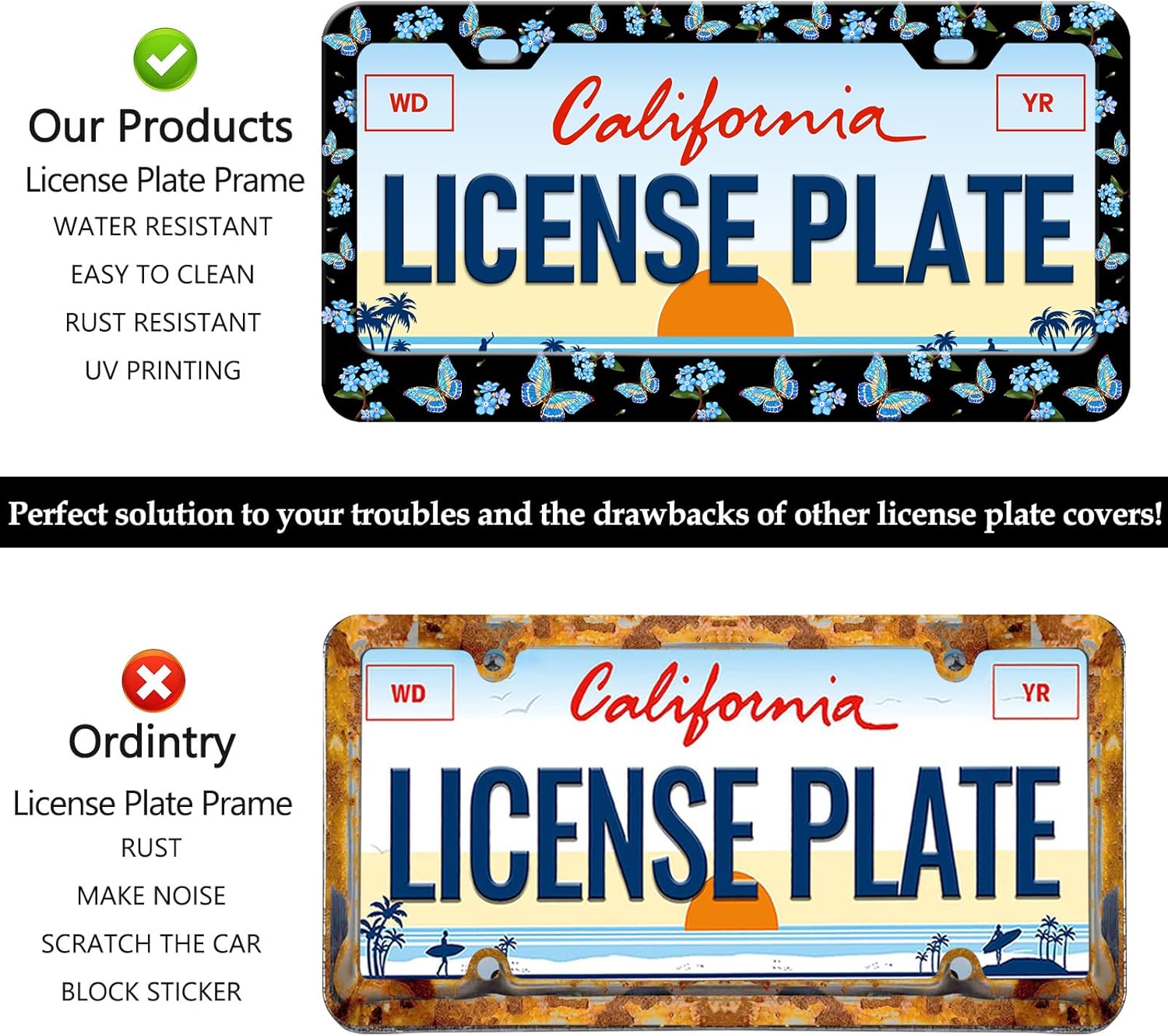 Blue Flower Butterfly License Plate Frames - 2 Pack Beautiful Butterfly Stainless Steel License Plate Holder,Rust-Proof Waterproof Car Decorative Tag Frame with Screws Fasteners Caps