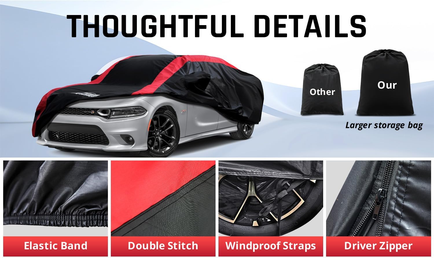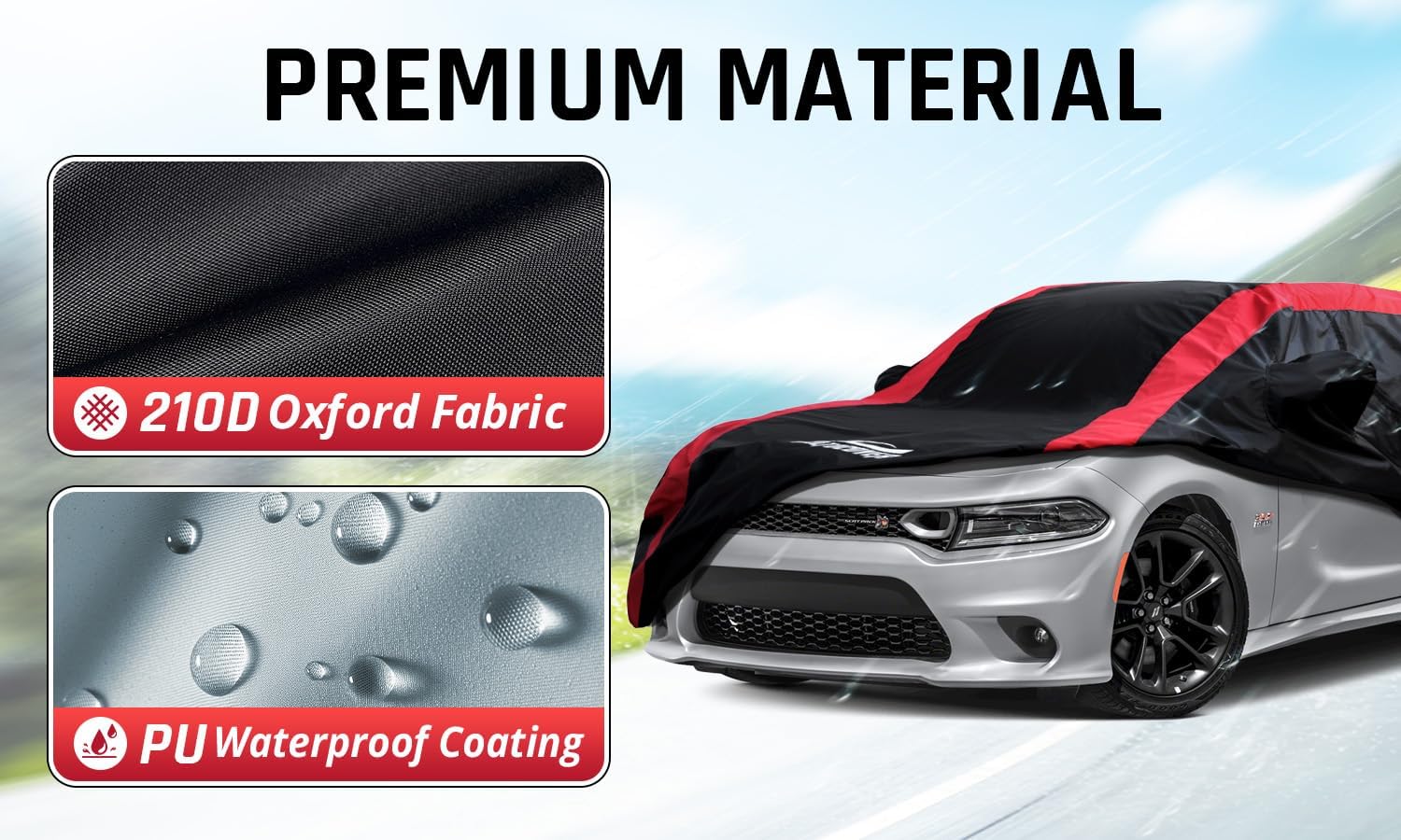 Dodge Charger Car Cover Waterproof All Weather with Red Strip Design, Custom Fit for Dodge Charger 2006–2023, Charger Accessory with Door Zipper & Windproof Straps