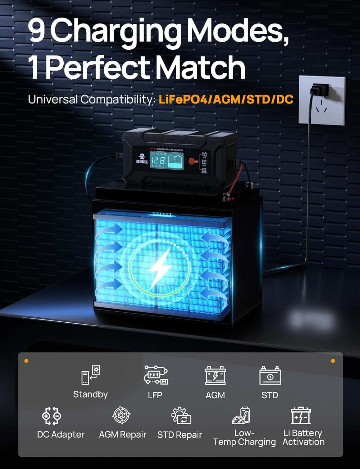 - Smart 9-in-1 Charger: 5A fast-charging with 9 modes - combines battery charger, maintainer, trickle charger and desulfator in one compact device. Perfect for all 12V LiFePO4 and lead-acid batteries(cars, boats, ATVs)