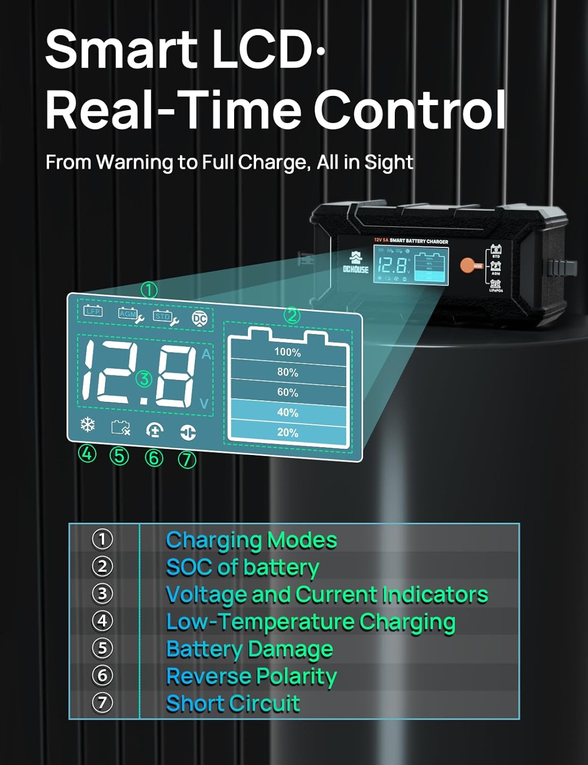 - Smart & Safe Charging: 5-stage intelligent charging in DC HOUSE battery charger with smart current control, plus multiple protection (overload/short-circuit/reverse polarity) and low-voltage alerts for battery safety