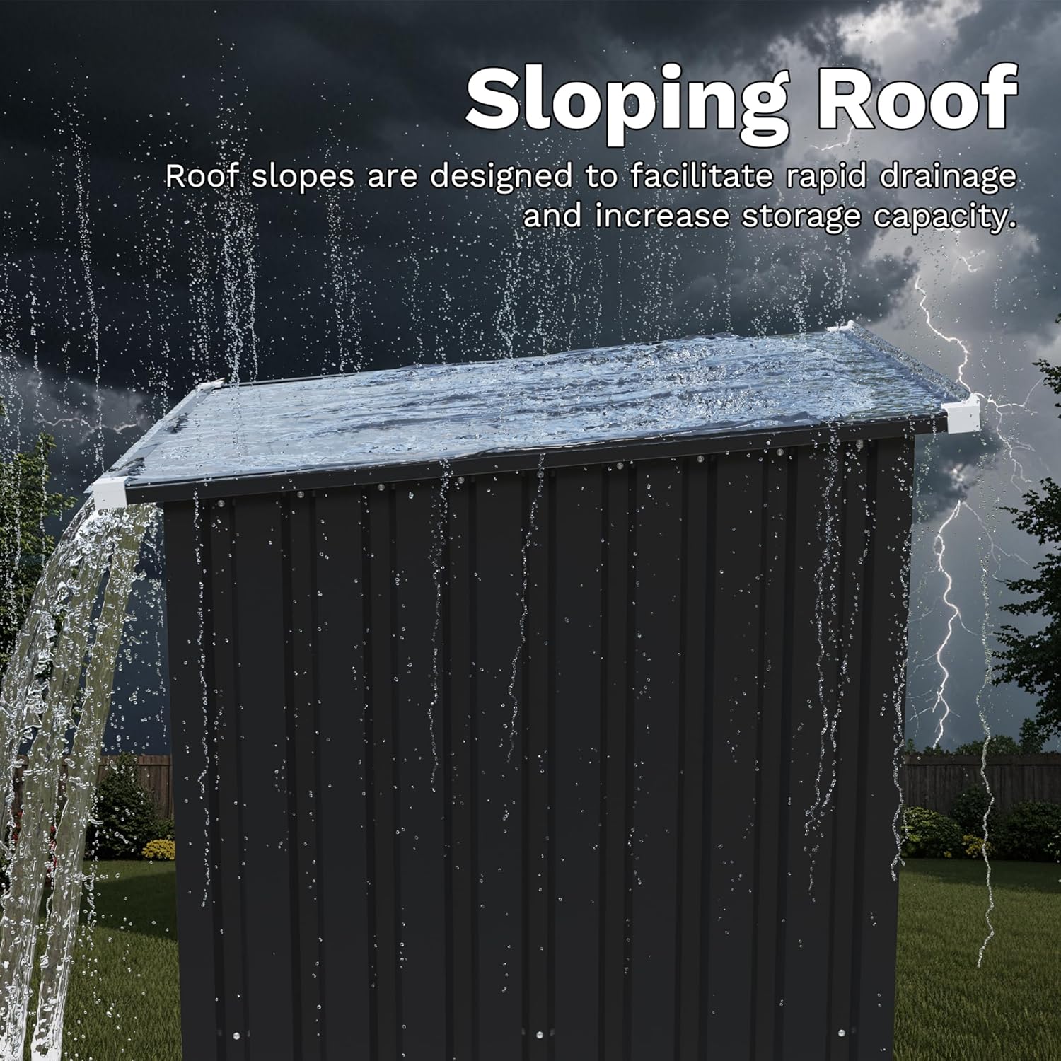 - [Unique Design]: The outdoor storage shed is equipped with a lockable door, ensuring security and facilitating convenient access to stored items. The slooping roof design offers enhanced storage capacity while mitigating the risk of rainwater accumulation.