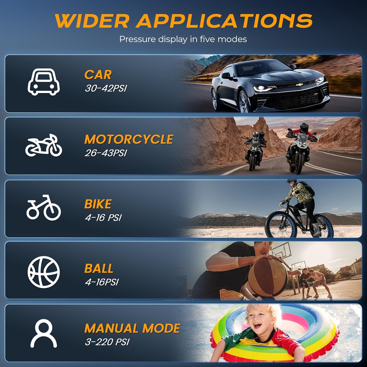 - 【4+N SMART MODES】Tire inflator Portable Air Compressor are preset with 4 pressure units: PSI, KPA, BAR, KG/CM², and four preset inflation modes: bicycle, motorcycle, car, and ball. The fifth custom mode can also set the pressure value according to the inflatable object, simple to use. Tire pump for car portable is an essential product for daily life and travel.