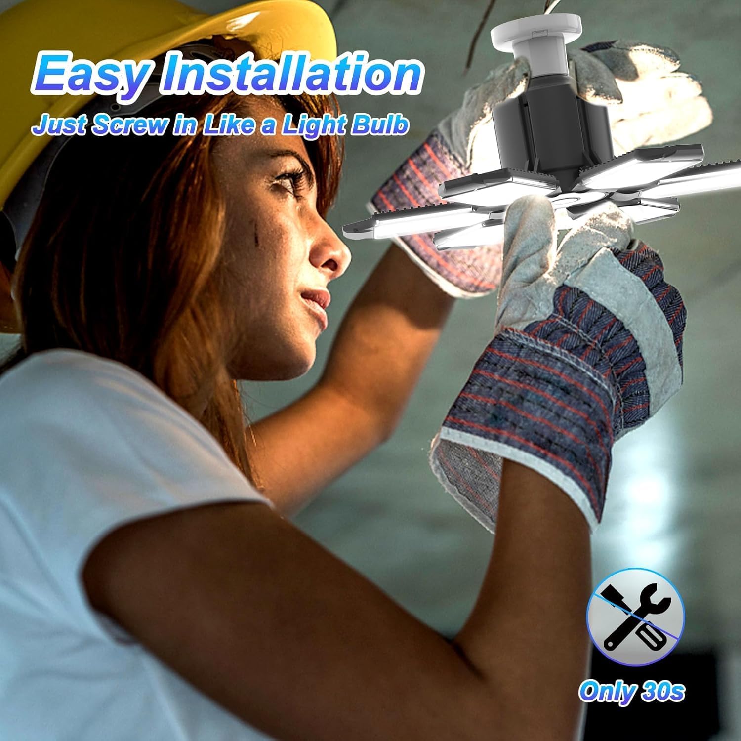 - Garage Lights with 360° illuminated range 90°Adjustable : This garage light is 8 panels design, each panel can be adjusted within the range of 0-90°, you can just tighten the screw to provide the correct lighting angle socket, and has a 360° illumination coverage range. The led garage ceiling lights with 357 lamp beads can illuminate the whole garage basement workshop and so on.