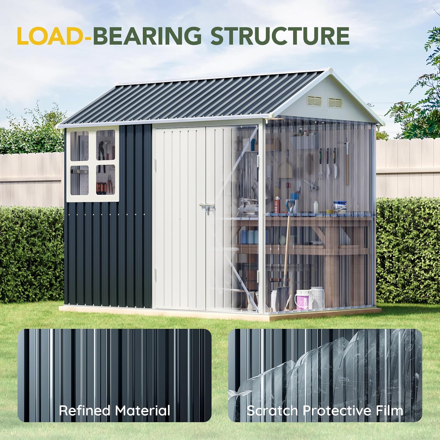 - Durable Construction: Crafted from galvanized steel, this shed is rust-resistant and weatherproof, ensuring long-lasting durability even in tough outdoor conditions.