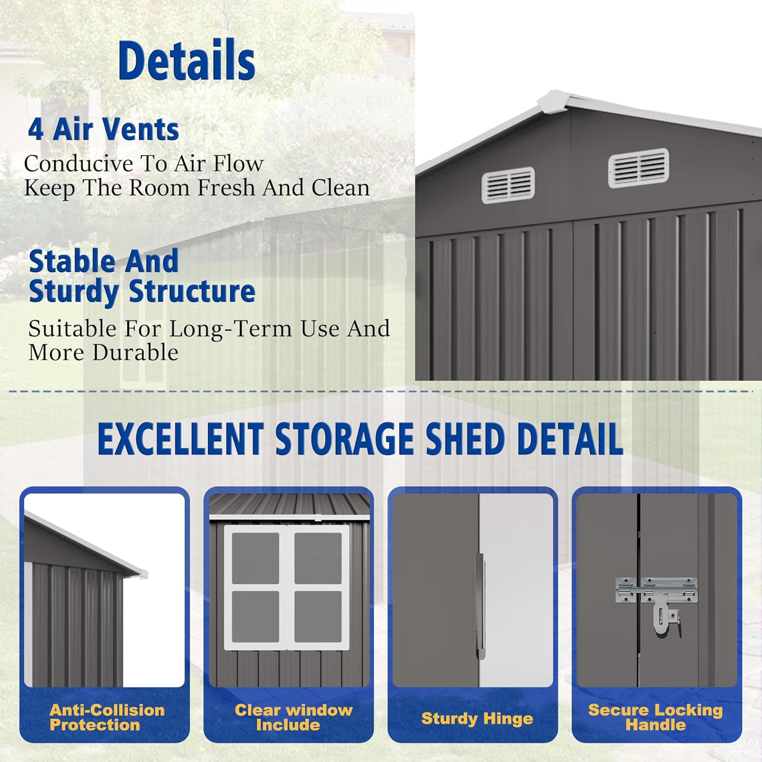 10 x 8 FT Large Outdoor Storage Shed w/Lockable Door, Heavy Duty Metal Garden Sheds with Clear Window and Air Vents, Waterproof Tool House for Bicycles, Tools, Backyards, Patios, Lawns, Gray