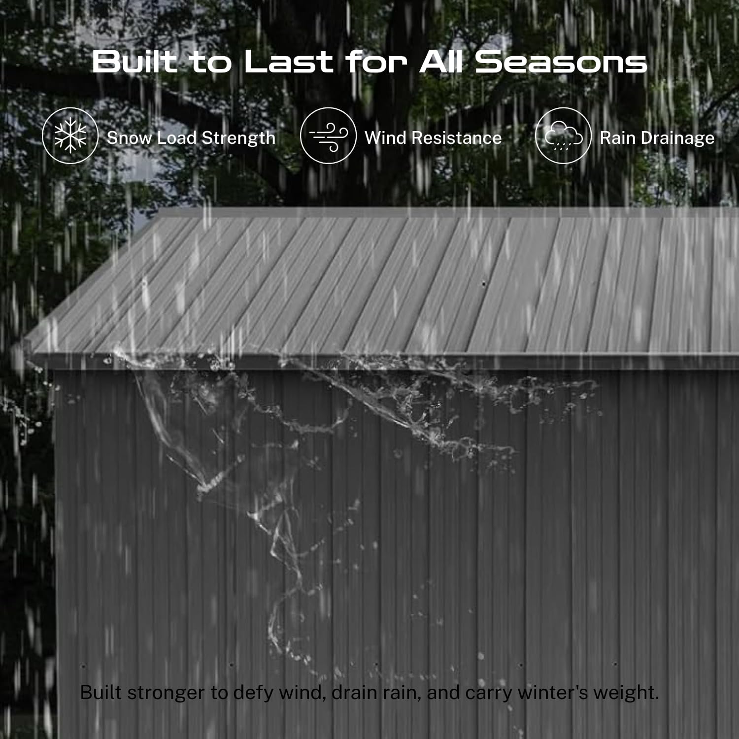 - ☔ [Sloped Roof for Superior Weather Protection] Designed for real-world conditions, the efficient sloped roof system guarantees optimal rainwater drainage, preventing damaging pooling and leaks. This key feature in our storage buildings and sheds clearance design minimizes maintenance and ensures your tools, equipment, and belongings stay consistently dry inside