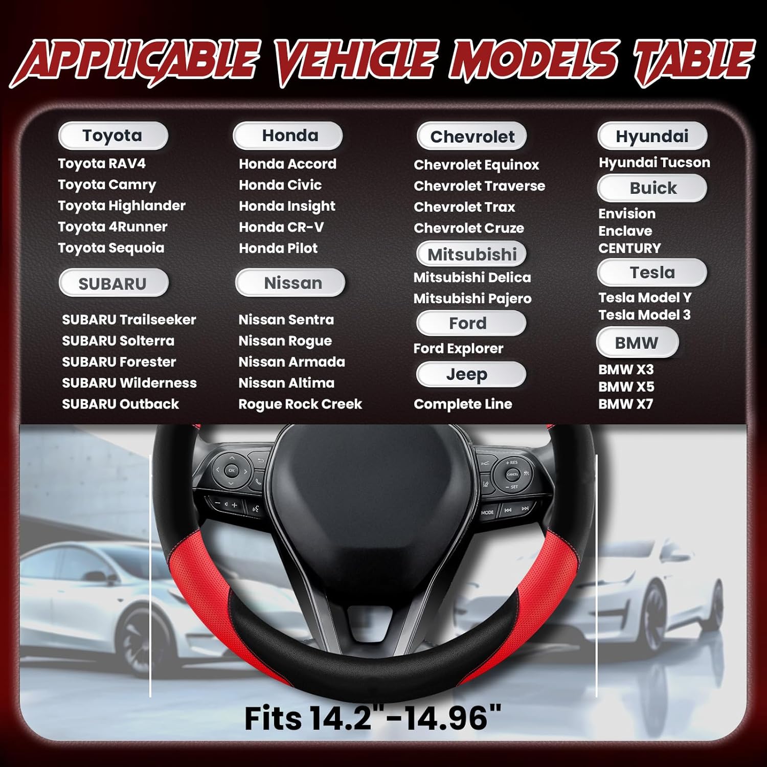 - FITS VARIOUS CAR MODELS :Perfectly compatible with Ford, Toyota, Tesla, Honda, Nissan, Chevrolet, Buick, Subaru,Volvo, BMW, Wrangler, Jeep, Hyundai, Mitsubishi 14.2-14.96 inch round steering wheel.