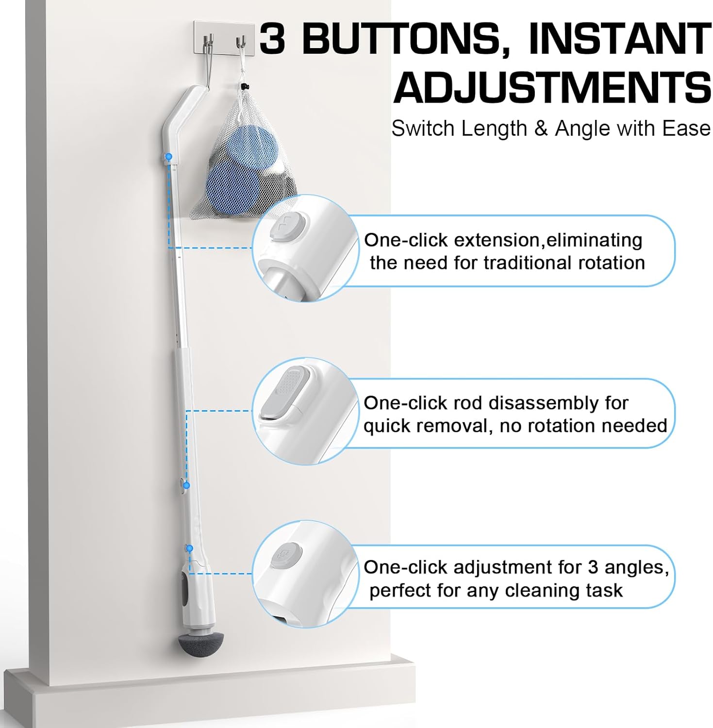 - EXTENDABLE LENGTHS & 3 ADJUSTABLE ANGLES BY 3 BUTTONS: Effortlessly switch between 90°, 135°, and 180° angles with the pool brush head, allowing you to effectively clean various surfaces and hard-to-reach corners. Combined with the extendable handle (16.5 to 53 inches), this scrubber adapts to any cleaning scenario