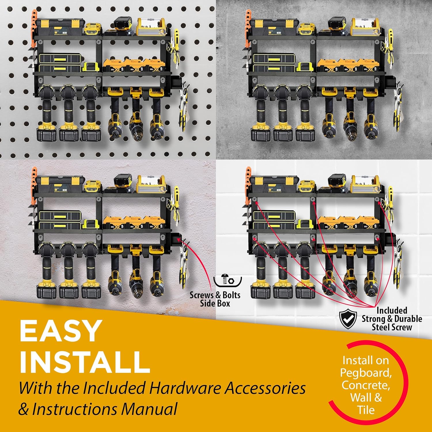 - Easy Assembly Tool Rack with Installation Accessories Included: Quick and simple to set up with clear instructions and all mounting hardware—compatible with pegboards, concrete, brick walls, and tiles.