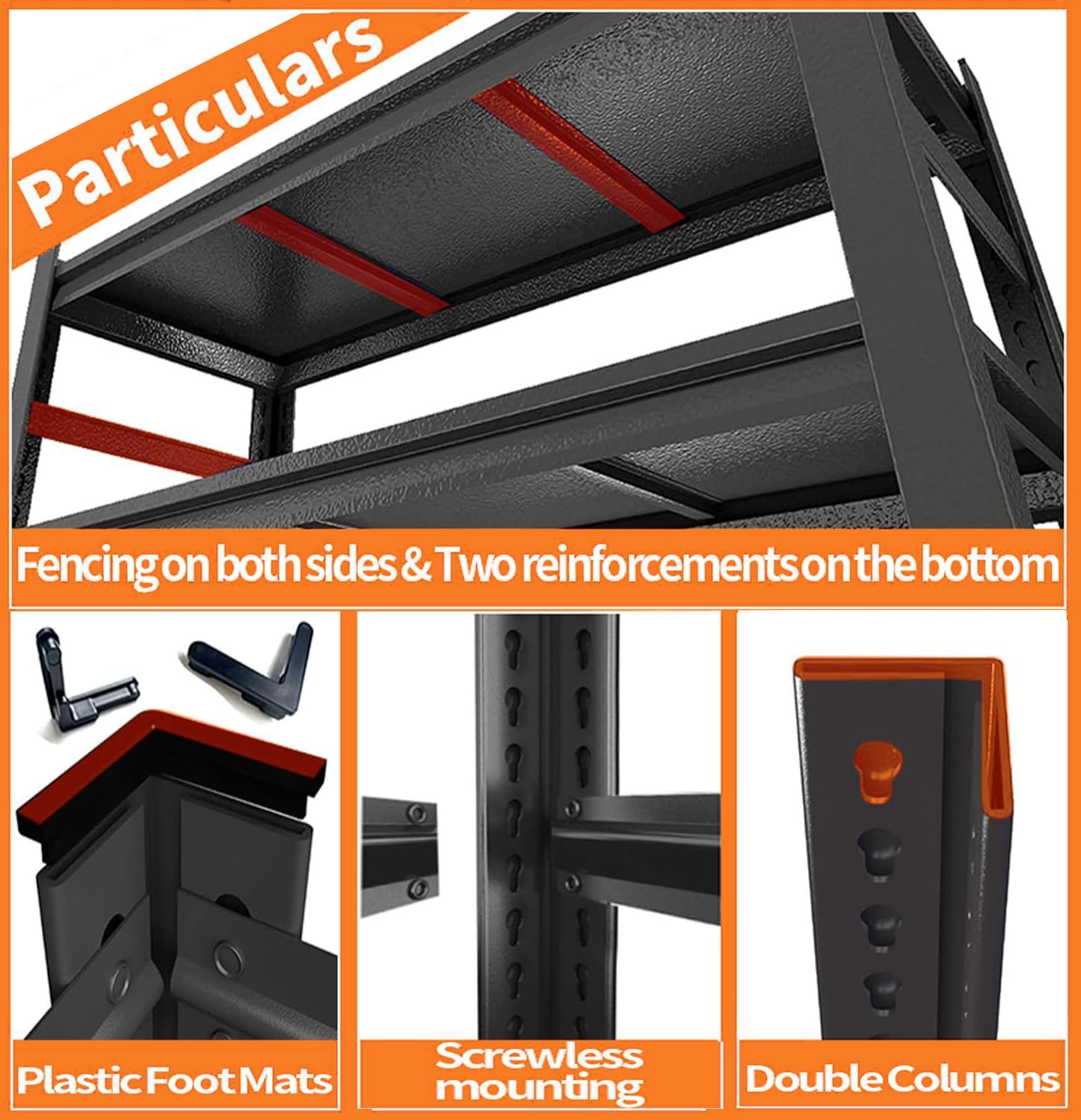 - ă3500LBS Metal Storage shelvesăThis metal garage shelving is made of high-quality thickened cold-rolled steel, with a hardness increase of 30% compared to ordinary steel. The double-layer column design greatly improves the stability and load-bearing capacity of the storage shelves, with a comprehensive load-bearing capacity of up to 3500LBS and a load-bearing capacity of 700LBS per layer
