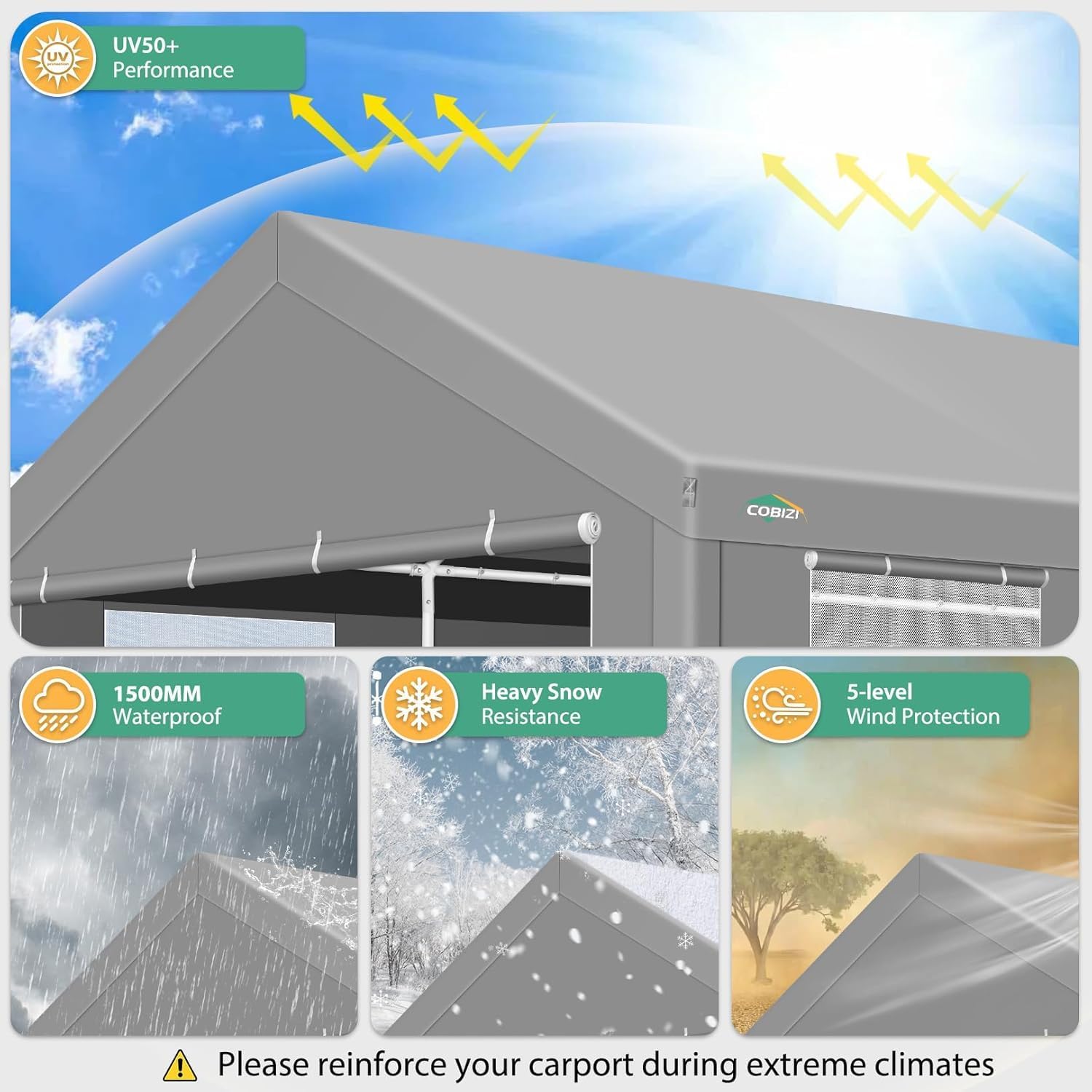 COBIZI Carport 10x20ft Heavy Duty Portable Garage, 2.0 Powder Coated Frame(Better Than Galvanized), Waterproof Shelter with Removable Sidewalls & Windows, Built-in Sandbags, for Car/Boat/SUV, Gray