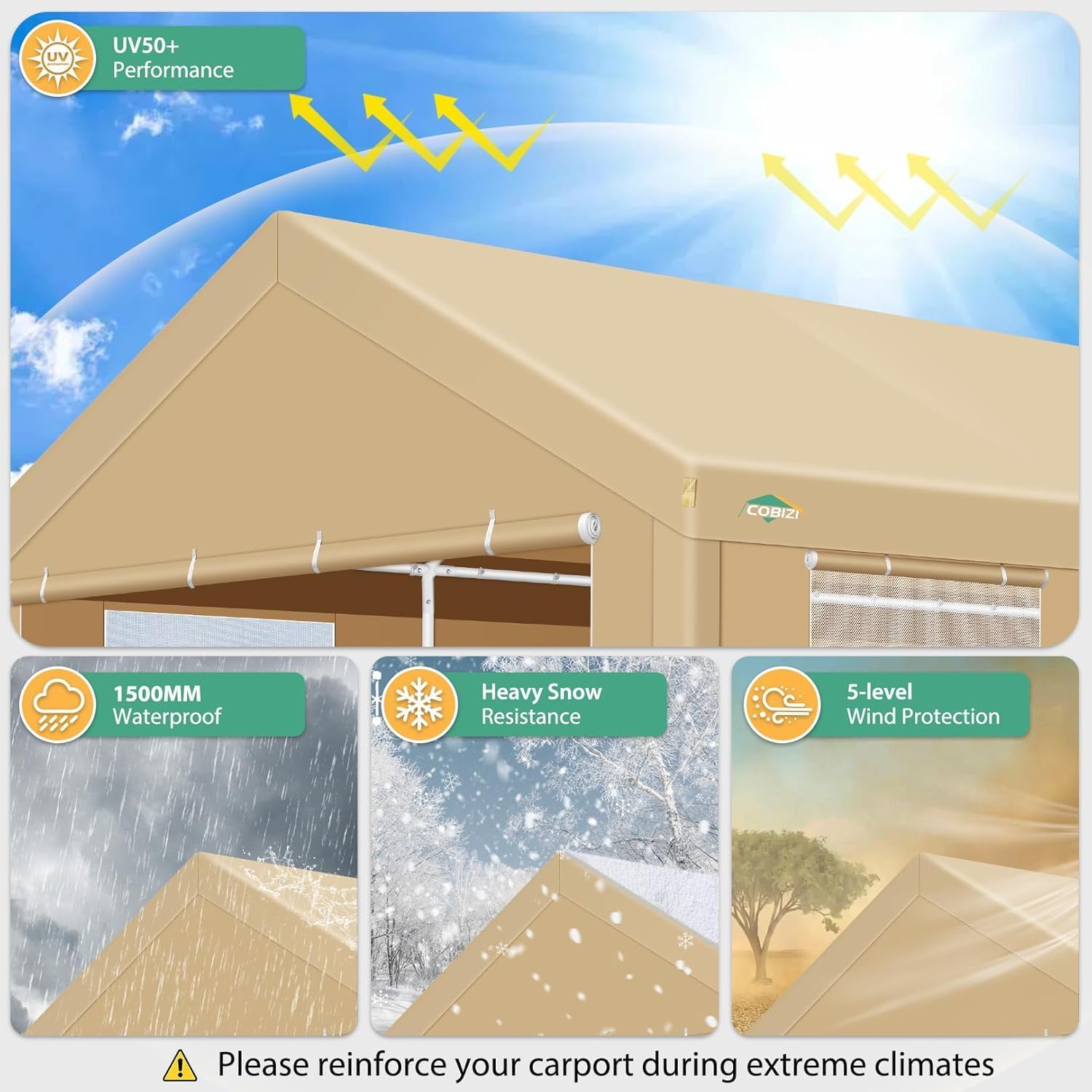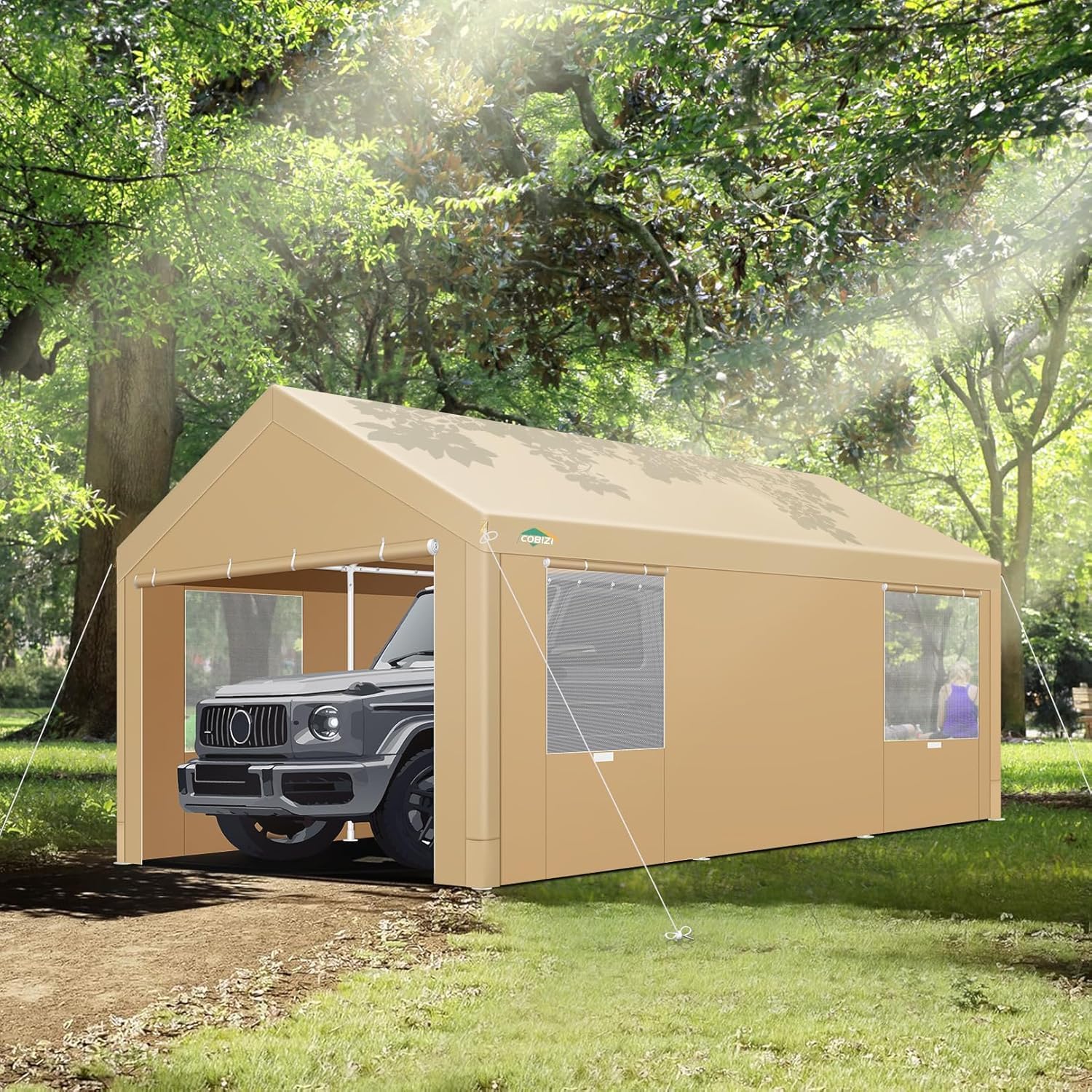 COBIZI Carport 10x20ft Heavy Duty Portable Garage, 2.0 Powder Coated Frame(Better Than Galvanized), Waterproof Shelter with Removable Sidewalls & Windows, Built-in Sandbags, for Car/Boat/SUV, Khaki