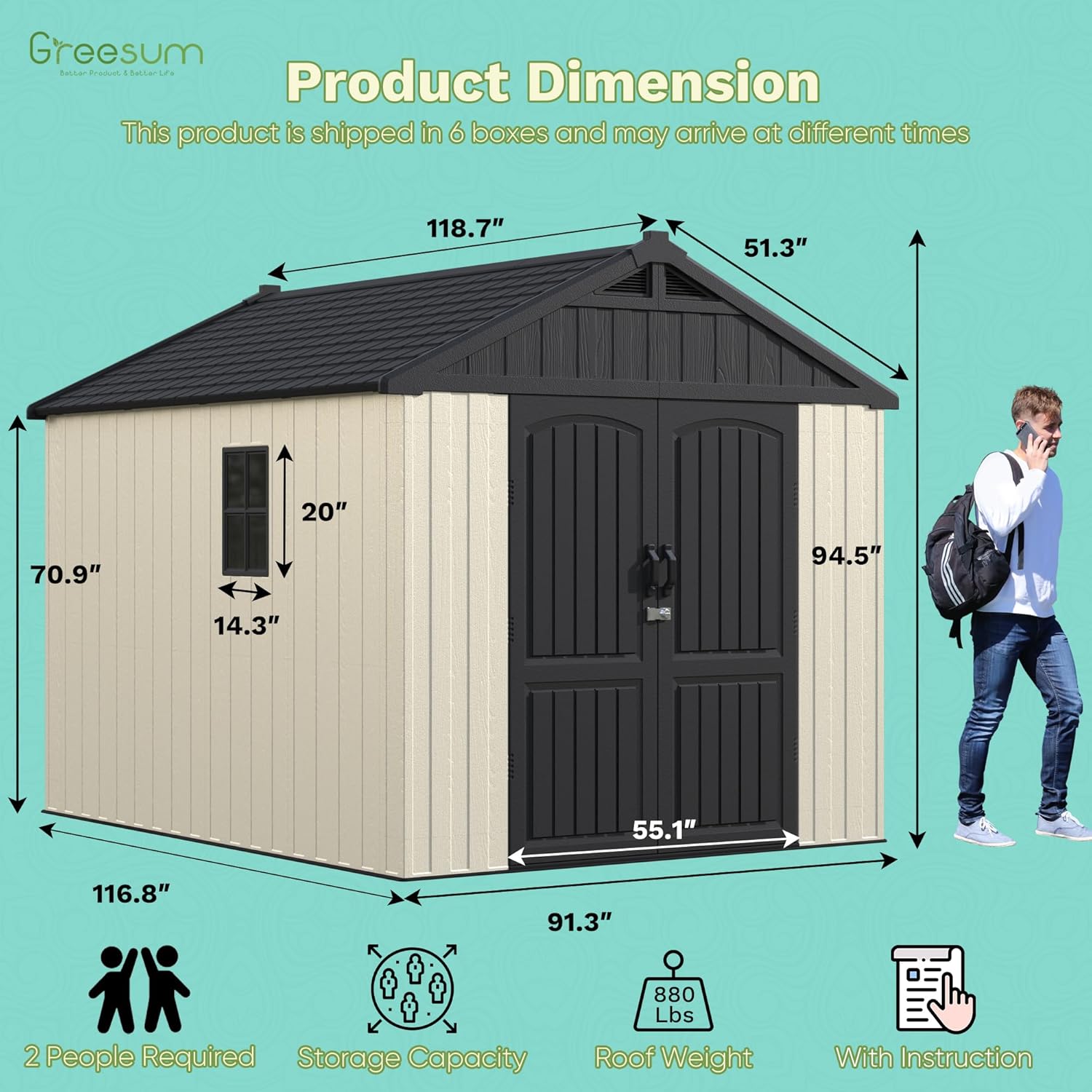 - Spacious Storage Solution: Measuring 116.8"D x 91.3"W x 94.5"H, this large-capacity shed offers ample space for garden tools, outdoor equipment, bikes, and more—keeping your belongings organized and protected.