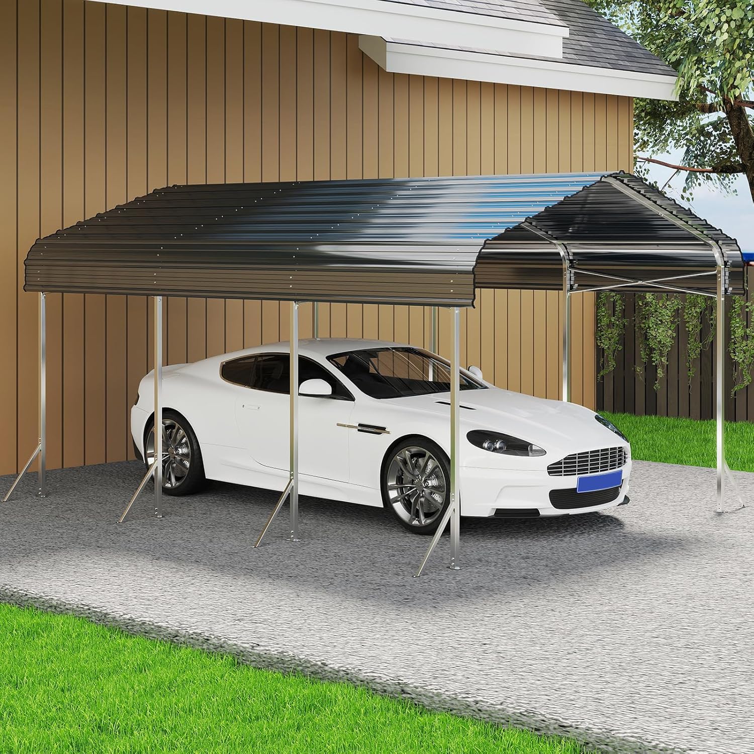 10x15ft Heavy Duty Metal Carport – Outdoor Galvanized Garage, Sturdy Structure, All-Weather Protection, Easy Assembly for Cars, Trucks, Boats, Tractors, and Outdoor Storage (Grey, 10x15FT)