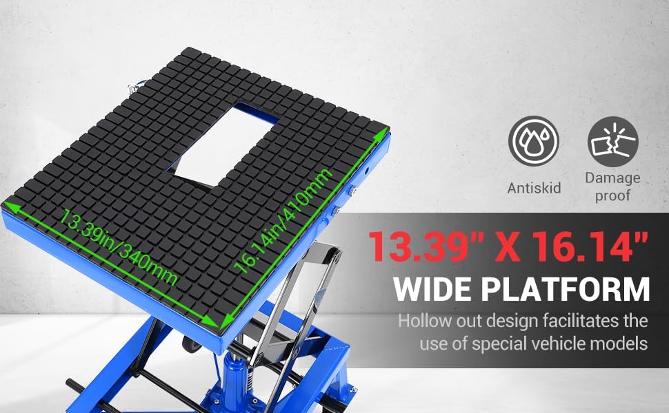 - Exceptional Safety with Heavy-Duty Construction ✔ 350 lbs Capacity & Solid Steel Frame: High-strength worm gear transmission and scissor structure ensure secure lifting for motorcycles, ATVs, and dirt bikes. ✔ Safety Pin & J-Hook: Prevents shaking or overturning during maintenance. Locking pole and bolt add double protection against accidental drops. ✔ Anti-Slip Rubber Pad: Striped veins on the top surface protect your vehicle from scratches and slippage.